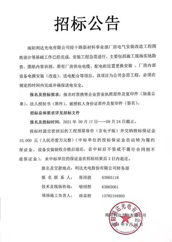- (2022-09-29)光電新區三期廠房一層裝修施工的招標公告